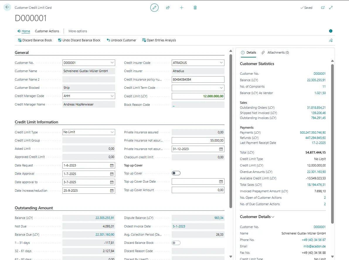 Med Credit Limit App har du fuld kontrol over kunders kredit. Appen overvåger automatisk kreditgrænser ved hver salgstransaktion, forhindrer overskridelser og reducerer finansielle risici – direkte i dit ERP-system.