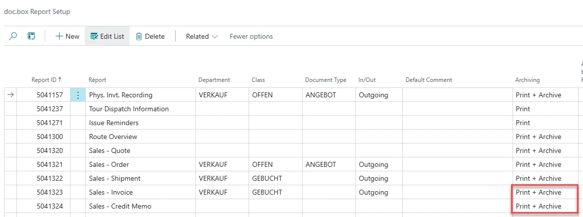 The checkbox in the Archiving by Reprinting column can stay inactive for Sales Invoices and Credit Memos. However, it can make sense to activate it for Sales Quotes, for example, to ensure all versions of a Sales Quote are saved in the Doc Box archive.