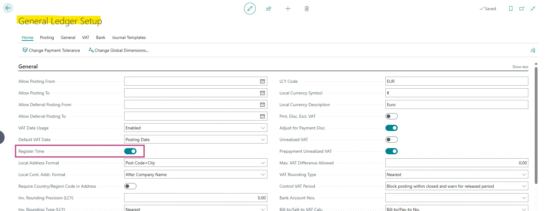 Open Boekhoudinstellingen en schakel Tijd registreren in zodat Business Central de inlogduur van gebruikers in het algemeen kan registreren.
