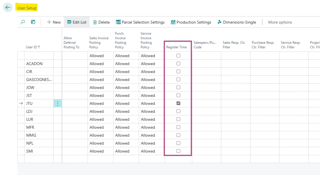 Open Gebruikersinstellingen en schakel Tijd registreren in voor de gebruikers die je wilt evalueren. De instelling moet zowel globaal als per gebruiker worden geactiveerd.