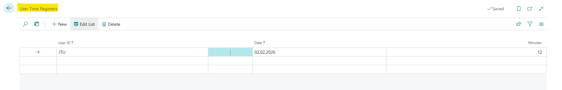 Open na enige tijd de Tijdsregistratie om te bekijken op welke dag een gebruiker was ingelogd en hoe lang Business Central open was.