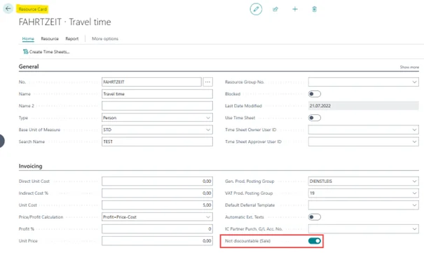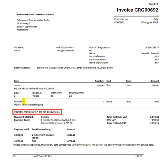 Als je nu een Verkooporder of Verkoopfactuur maakt met een van deze Artikelen, Resources of Artikeltoeslagen, een Betalingsconditie invoert die een korting bevat en het document boekt, zie je in het document dat de betalingskorting alleen wordt toegepast op de in aanmerking komende regels.