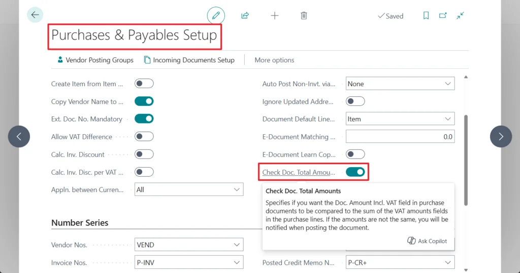 Activeer Totaalbedragen documenten controleren om de validatie van de Documentbedrag incl. btw en Documentbedrag btw velden op Inkoopfacturen en -creditnota’s mogelijk te maken.
