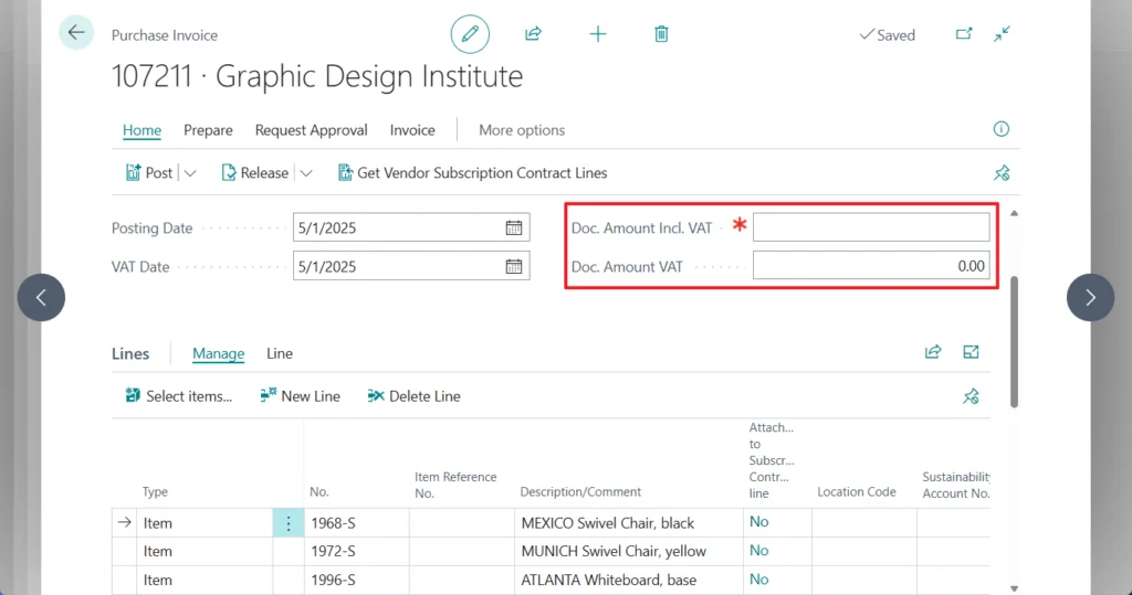 Business Central controleert automatisch of de som van de regels overeenkomt met het Documentbedrag incl. btw en Documentbedrag btw.