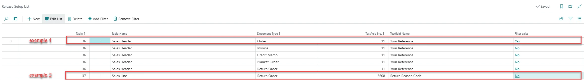 Selecteer 6608 (Retourreden) voor Test veldnr. om dit veld verplicht te stellen voor elke artikelregel in een Verkoopretourorder.