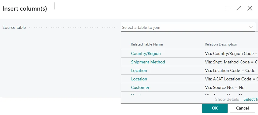 Suchen Sie die gewünschte verknüpfte Tabelle zum Beispiel Location oder Customer und wählen Sie diese aus.