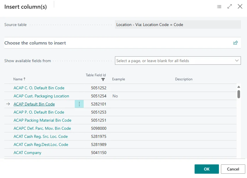Wählen Sie die Spalten aus, die Sie hinzufügen möchten. Sie können mehrere Spalten gleichzeitig markieren. Beachten Sie, dass die technischen Feldnamen aus Business Central angezeigt werden.