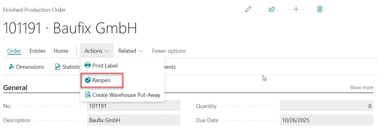 Da dies eine Standardfunktion in Business Central ist, findest du weitere Informationen bei Microsoft unter: Beendete Produktionsaufträge erneut öffnen | Microsoft Learn