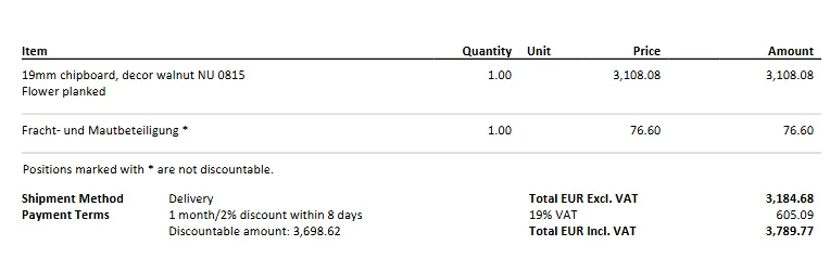 Eine Ihrer Aufgaben als Vertriebsmitarbeiter ist es Vorauszahlungsrechnungen an Ihre Kunden verschicken. Während auf der Verkaufsrechnung alle Artikelinformationen inklusive Menge und Maße angedruckt werden, wird auf der Vorauszahlungsrechnung nur der Gesamtbetrag pro Zeile angedruckt.