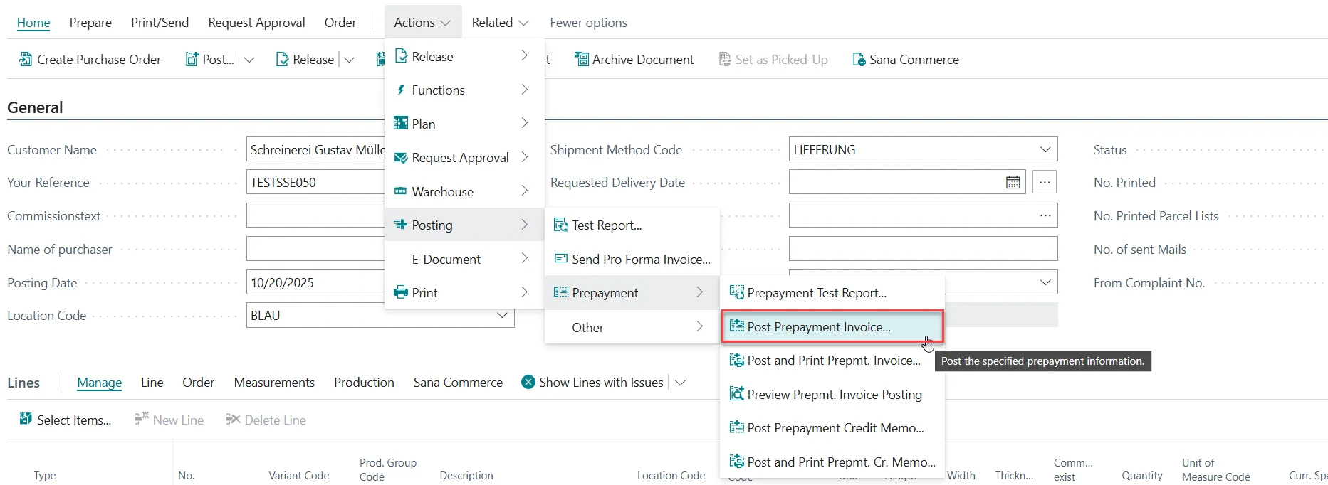 Klicken Sie im oberen Menü auf Aktionen, Buchung, Vorauszahlung und Vorauszahlungsrechnung buchen.