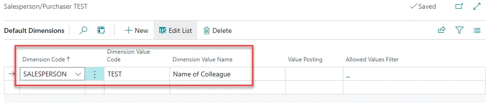 In unserem Beispiel möchten wir dies für Verkäufer einrichten. Geben Sie daher die neu erstellte Verkäuferdimension in das Feld Verkäufer Dimensionscode ein.