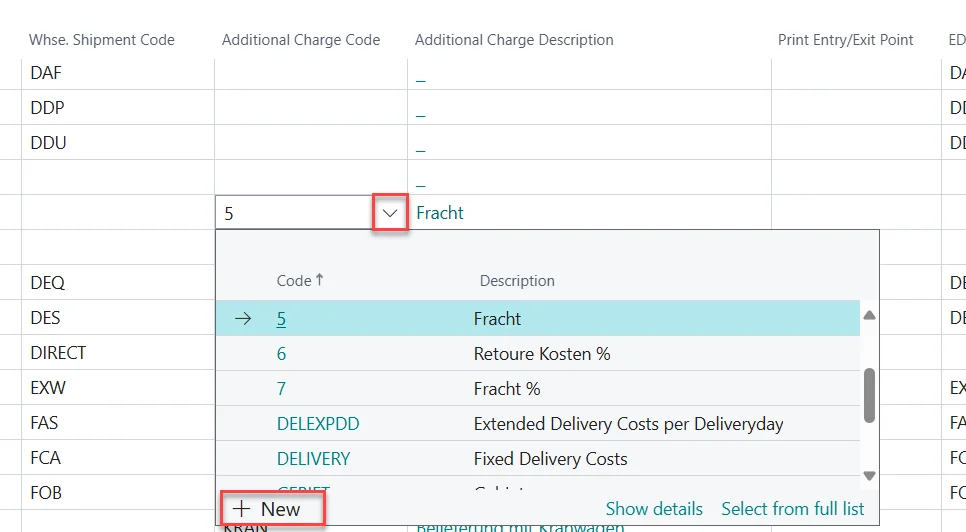 Wir passen die Lieferbedingung Lieferung die wir im vorherigen HowTo erstellt haben, an. Öffnen Sie das Dropdown-Menü in der Spalte Zusatzkostencode und klicken Sie auf +Neu.