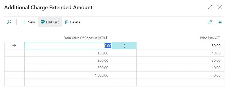 In der Liste der Zusatzkosten, geben Sie z.B. DeliveryEx in die Code-Spalte und Lieferkosten je Auftragswert & pro Liefertag als Beschreibung ein.